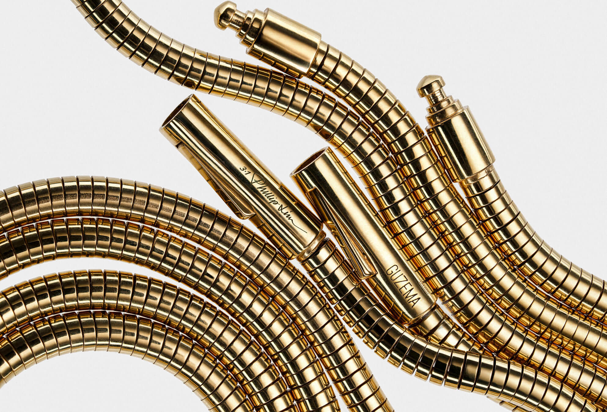 Just in time to celebrate an auspicious Year of the Snake, the collection features two styles – a snake choker and matching bracelet in sustainably sourced metals, each with the signature 3.1 Phillip Lim logo engraved alongside Guzema on each clasp.